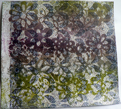 Shimmer Goosebumps was sprayed over these next two sheets of printed background papers, then inked with rainbow ink pads using a brayer, then sprayed with Ink Potion no. 9 blending solution.